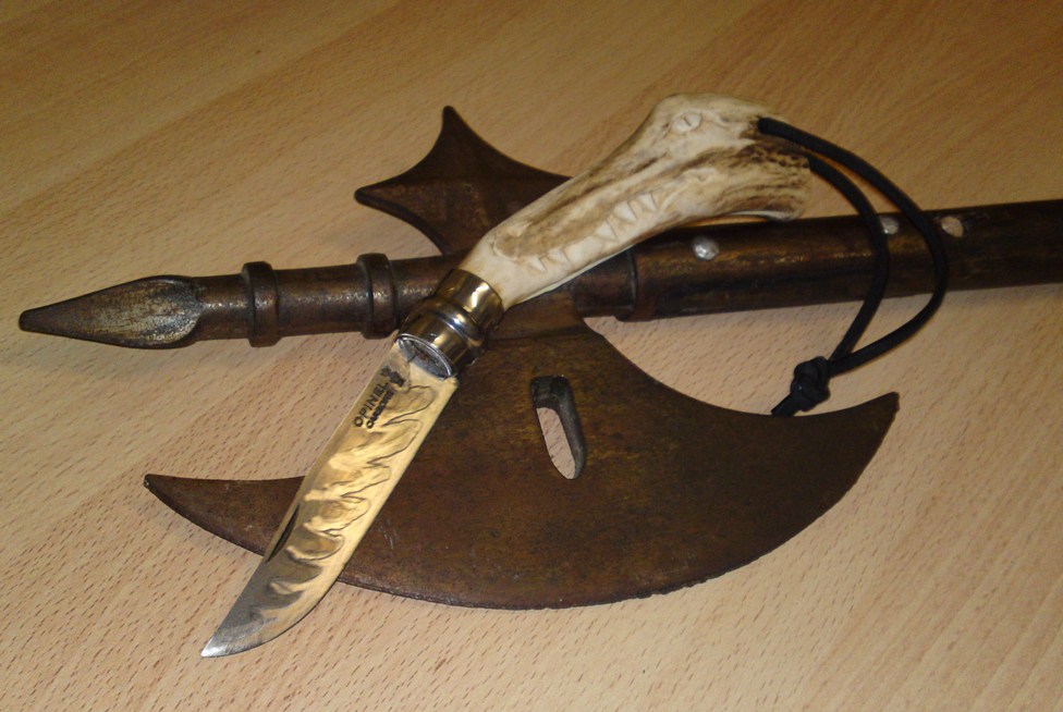 Evo danas sam zavrsio doradu mog opinela 9 ... nije mnogo ostalo od orginalnog , ali eto kako od jeftinog noza moze da bude unikat ... sare na ostrici sam napravio senfom , a rog posle graviranja sam potamnio talogom crne (turske ) kafe inace s jedne strane je kroko jer sam hteo da iskoristim prirodan oblik drske , a na secivu su kao zubi , a s druge klasicna floralna gravura pa je i na ostrici taj fazon ...