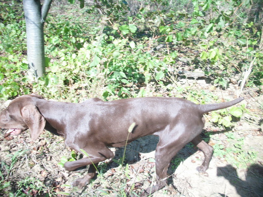 Pošto kerić nije bio uveden u lov, radili smo naporno mesec dana, naučio je dosta toga, pošto je od dobrog materijala (porekla). Promarkirao je, nije to još ona prava čvrsta marka, nema on strpljenja da stoji u marki duže od 7-8 sekundi, mlad je. Evo jedne na brzinu uhvaćene marke (bolje Master markira, nego što ja slikam, otfikario sam mu nos na slici ):