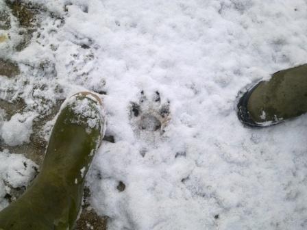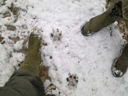 za lisicu je presirok,za sakala se ne vidi napred kod srednjih prstiju da li je taban spojen jer je odvisine slikano,ali i to nije,za vuka moze biti,mada i za to nemam vecinsko misljenje jer je sneg koji je na slici mokar i topljiv paotisak mora biti sto posto pravilan,a onda bi od vuka bio uzi preko sredine a duzi u pravcu kretanja,tako sirok bi mogao samo biti kada trci ali ovo nije trag od divljaci koja trci pa tako da nije ni od vuka,....i ispade da je to ker,najvise lici tragu kera.