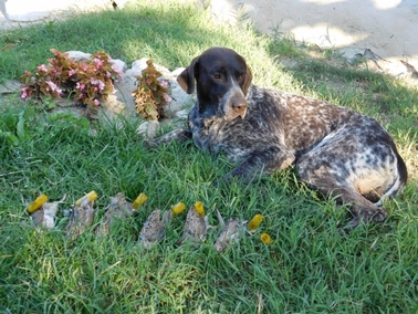 Konacno prvi ovosezonski izlazak.Ptica dosta,lepa rosa i lagan vetric.Pucao samo iz marke i od sedam pokusaja sest puta uspesan.Iako van forme,Ares odlican,narocito prvi sat,kasnije malo pao u tempu a i ptice se povukle u kukuruze i suncokret.idemo ujutro da utvrdimo gradivo,a posto sam jutros zaboravio aparat jedna iz dvorista.