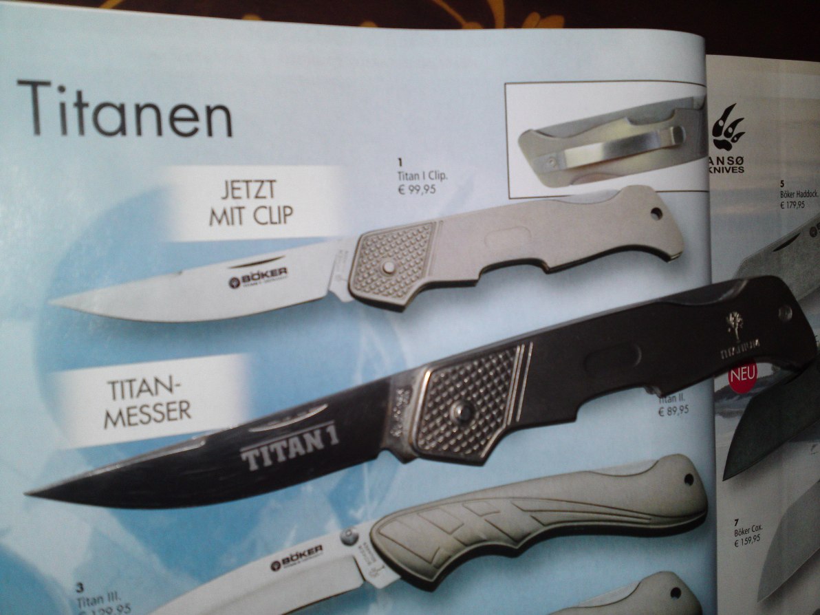 Evo jos jedan vrlo interesantan folder , koji nosim cesto sa sobom .. titan sa dvaput kaljenom ostricom i rucno ostren fabricki ... moj je prva generacija ima ga i dalje u Bokerovom katalogu , vidi se i cena ... vrlo tanak , lagan ali cvrst i sece daleko bilo ... jedno vreme sam ga nosio u novcaniku zbog preazurnih plavaca ..