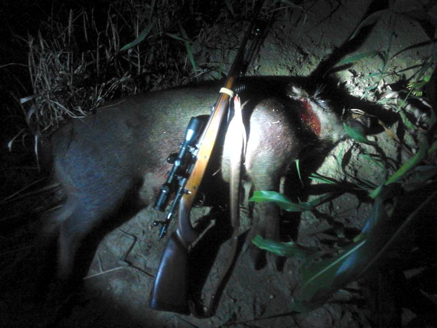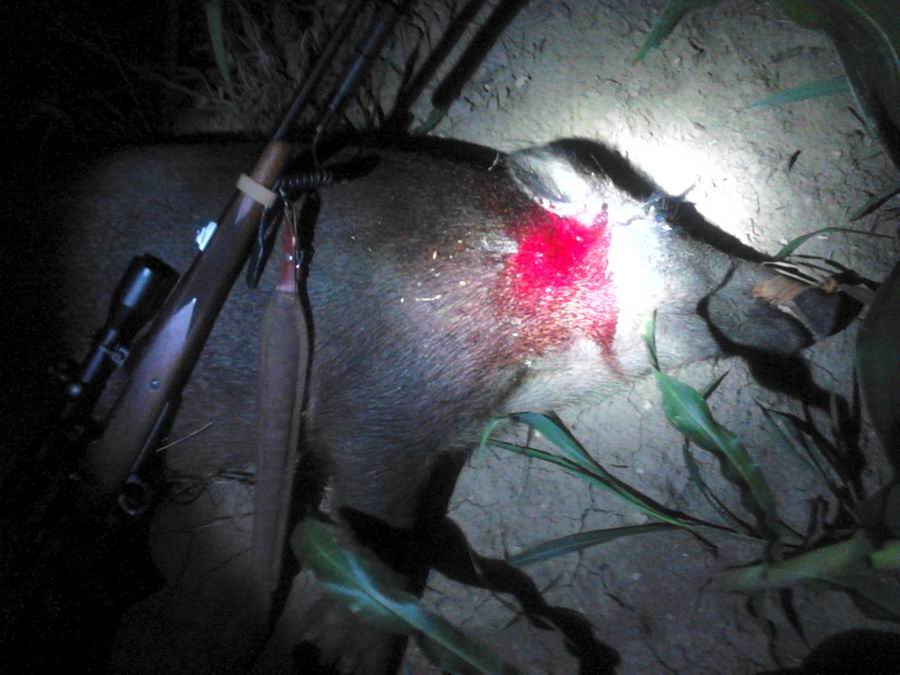 Čestitam. "Zauška" je "keva". Ima još jedno mesto na svinji koje švabe preferiraju. Probao, radi. Po prednjoj nozi, digneš na pola visine, pa za šaku napred. To ovi što pucaju sa 6,5 i 7x57 čuvaju kao najveću tajnu. Pada na mestu.