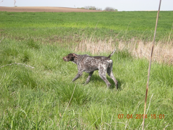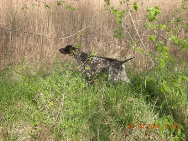 Pre neki dan sam išao do kolege da vidim mužijaka kojeg još onomad pazarih kao prelepo štene od kolege Sale Vobana. Kao što sam i predpostavljao radi se o izuzetno pametnom i radnom psu(kolega se nemože nahvaliti kako lovi sa njim), izuzetno vodiljivom, sa predivnom i tinom "la Balzak" glavurdom, jak, kurpulentan mužijak sa nekoliko mana (zadnje noge i po meni previsok)..karakter fantazija!!