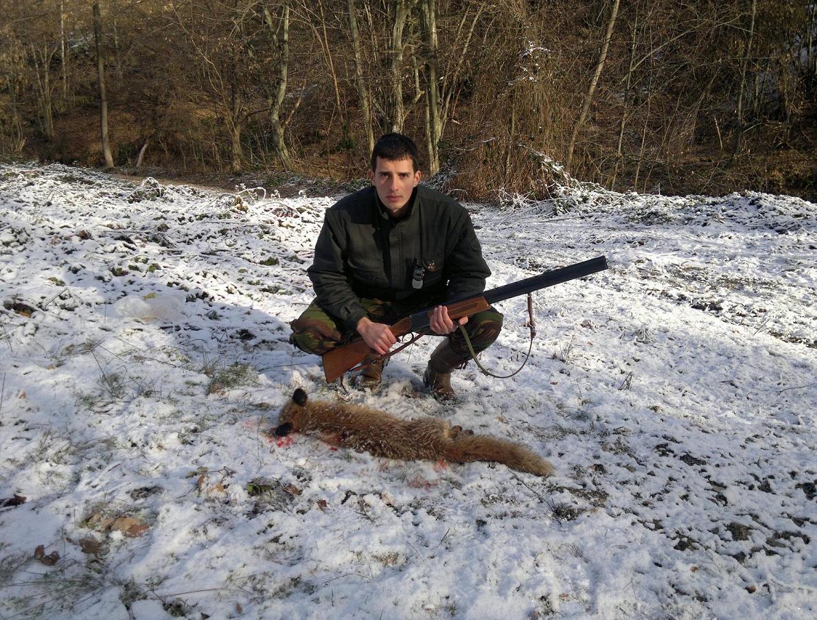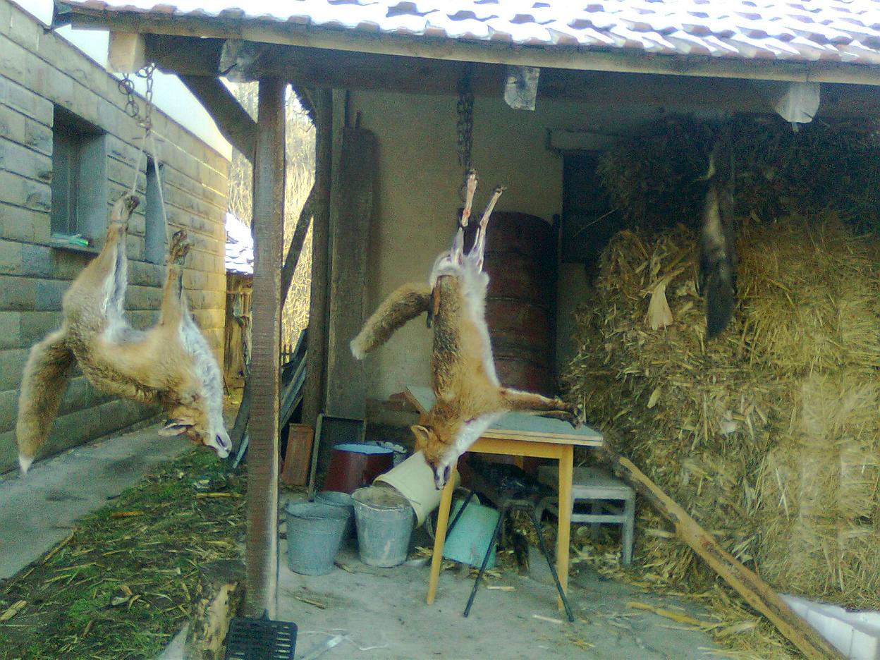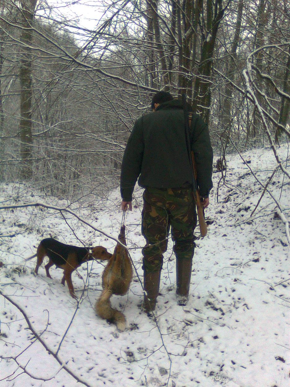 Jutros oko 7h ista ekipa i isti dvojac pasa-Cisko i Vidra. Psi nervozni, željno očekuju lov te ih puštamo na isti teren gde smo prošli vikend odstrelili lisicu. Odmah po puštanju u potoku koji deli dva poveća brda počinje odzvanjati lavež pasa. Nakon 10 ak min. gonjenja lija beži ka rupi i tu je spremno dočekuje moj drugar Ivan. Izvlačimo je iz potoka i dok smo se fotografisali na 80m od mesta gde je lisica odstreljena u daljini čujemo naše pse kako se javljaju na nekom tragu i odmah potom kreće voljena pesma goniča.Ovaj put menjamo pozicije te ja odlazim na istu čeku nakojoj je kolega bio i odstrelio prvu lisicu, a ubrzo po postavljanju zasede stiže i krupan lisac bežeći ispred pasa i protrčava na 5 m od mene. To mu je je bilo poslednje razgibavanje. Veoma dobar lov, odličan rad pasa i još bolje druženje.